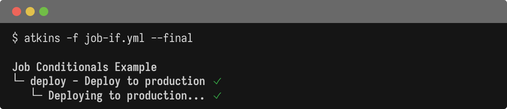When a job or step is skipped due to a condition, the tree output shows the condition: