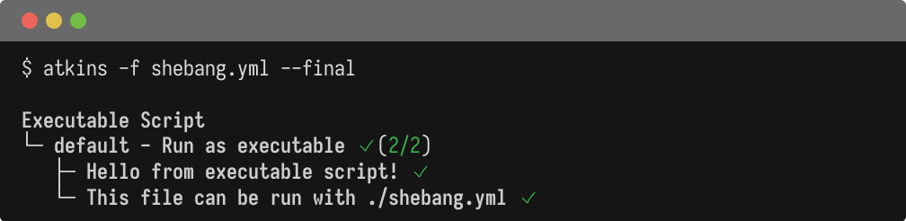 Atkins strips the shebang line before parsing, so the file remains valid YAML for other tools.
